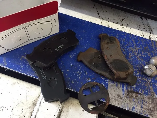 ご入庫いただいたら、足回りのチェックをします。今回はブレーキパッドの残量が少なかったため、お客様にご連絡をし、交換依頼をうけましたので交換させていただくことになりました。
