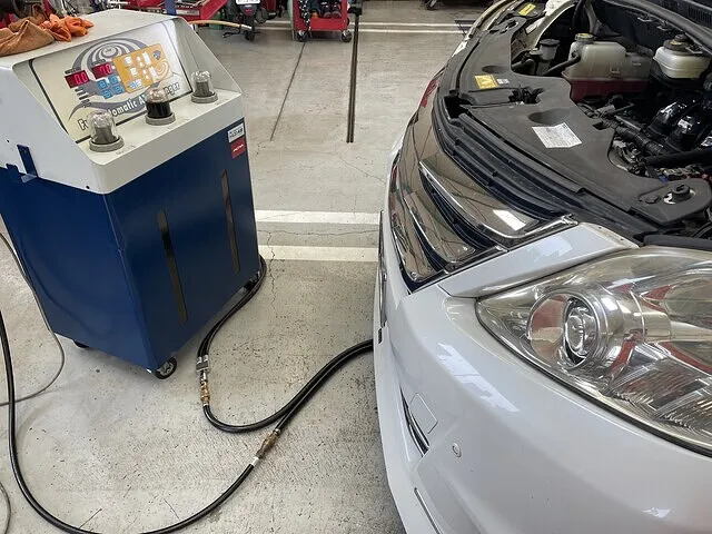 たつの市のお客様よりフーガのトルコン太郎圧送式によるATF交換のご依頼をいただきました。今回はwakoSセーフティATF10Lでプレ洗浄を行い、プレミアムATF10L交換しました。最後にお客様からのご要望で添加剤のwakoS・ATプラスを注入。