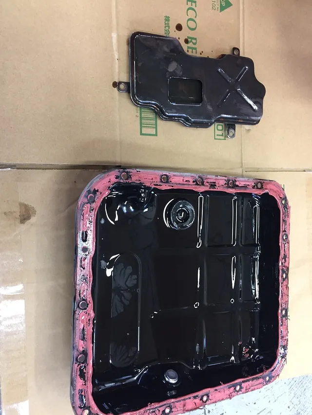 お写真のとおり、オイルパンとストレーナーを取り外すと泥や汚れがたくさん付着しております。ATFの汚れは大半オイルパンに溜まることが多いので、オイル交換をされるときは一緒に洗浄することをおススメしています。